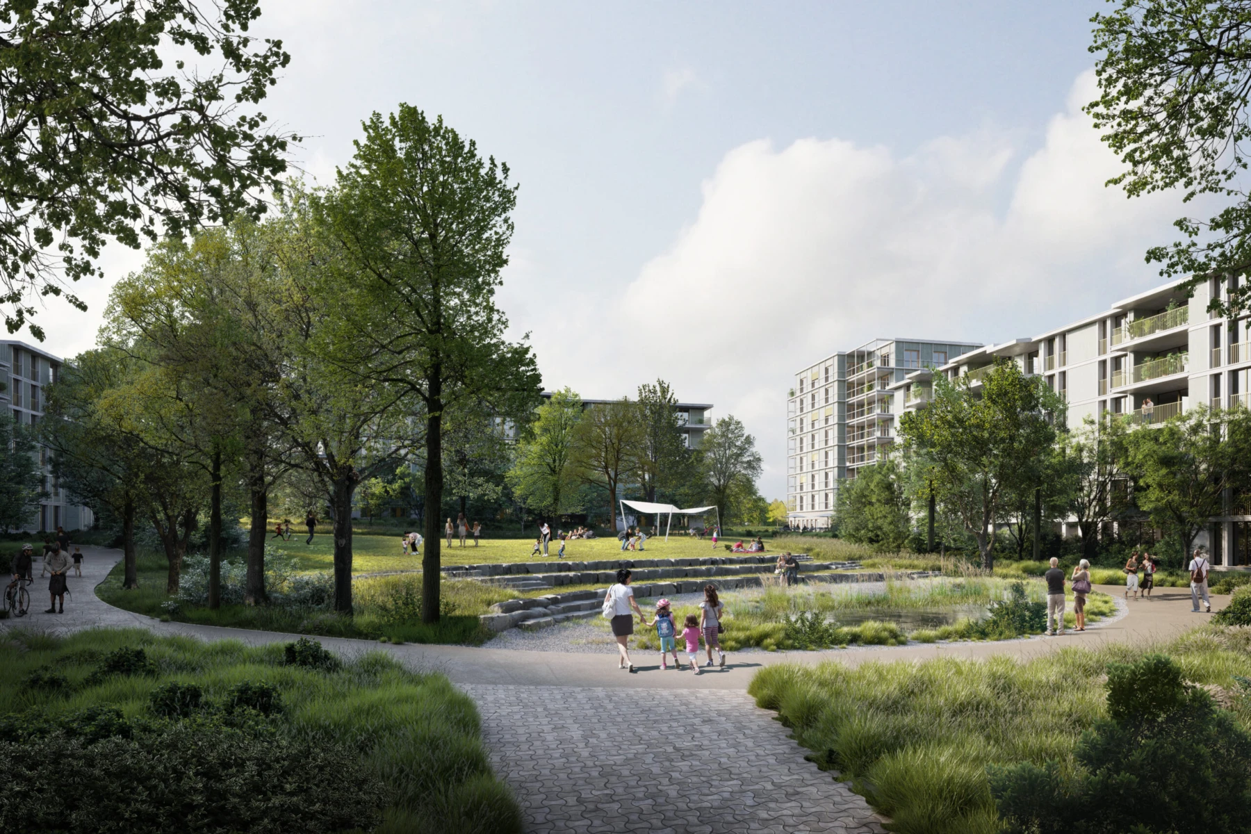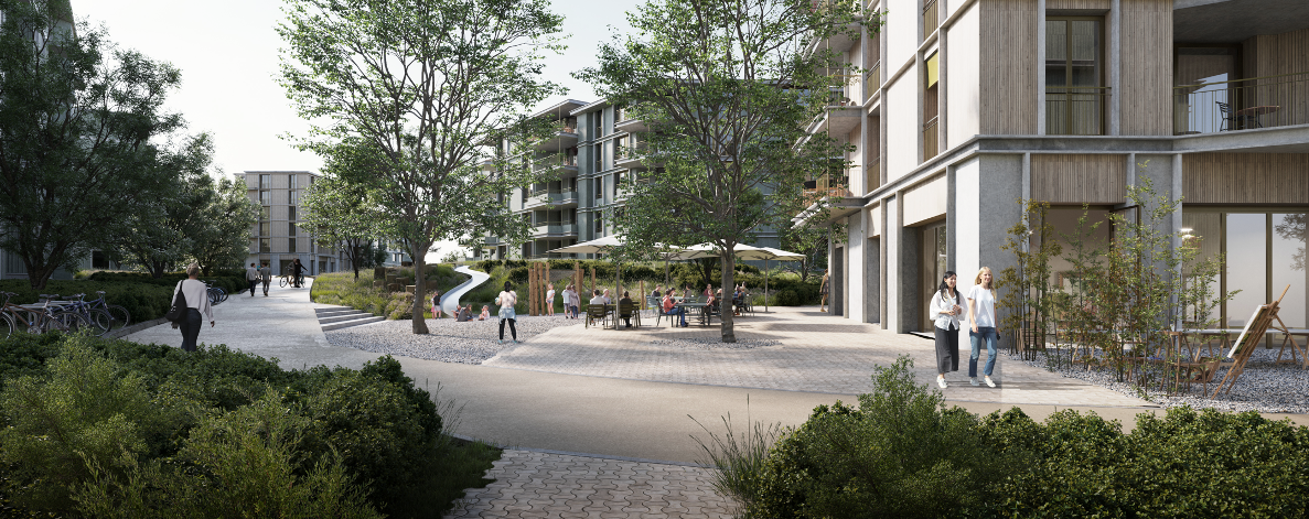 Der heutige parkähnliche Charakter bleibt erhalten und die Aussenräume werden aufgewertet. Wertvolle Hecken und Baumbestände bleiben erhalten, ebenso Spielzonen für Kinder und Aufenthaltsbereiche für Familien.